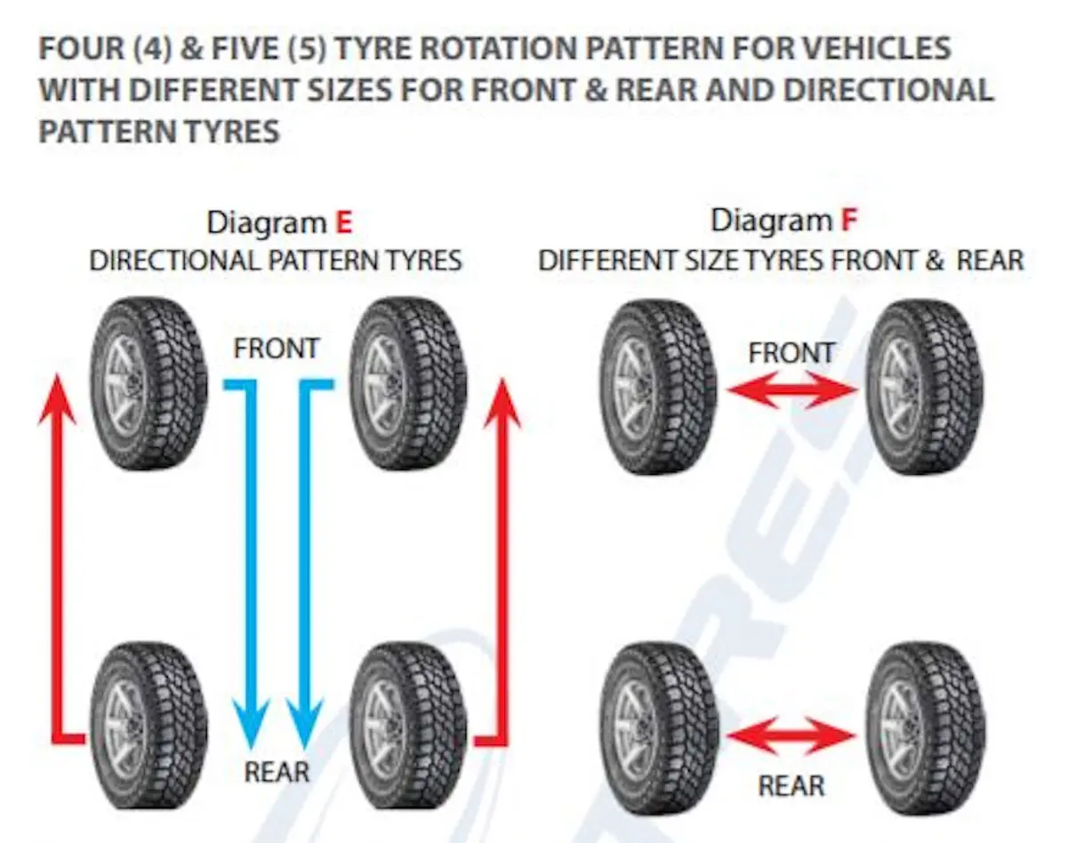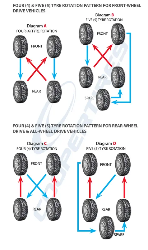 Relying on your local tyre dealer to know this information is not always a good idea, as the rotation pattern is different for Front-Wheel Drive (FWD), Rear-Wheel Drive (RWD) and All-Wheel Drive (AWD) vehicles. Throw in the problem of incorporating a fifth tyre (the spare), and the subject becomes even more confusing.
