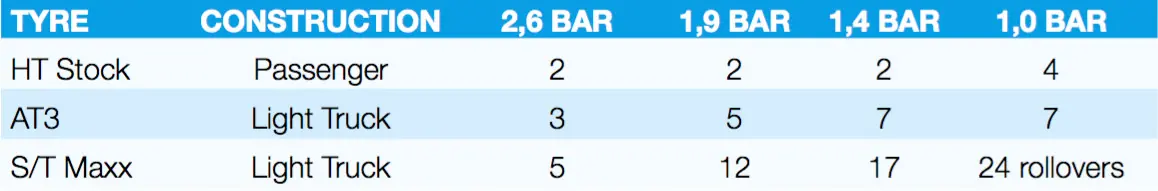 Their test involved driving each tyre (fitted to a Hilux 4×4) over a steel spike. They recorded how many times the tyre could roll over the spike before it was punctured. However, they also performed this test at varying tyre pressures. Here are the results of that test: