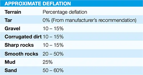 Unfortunately, there’s no straightforward answer to this question, as no two vehicles are alike; also, there are terrain variations to consider, and the fact that tyre construction vastly varies from one manufacturer to the next. The table below offers a rough guide to deflation percentages, but (in the end) it’s really a dark art that every off-roader must master, a process of trial and error that starts and ends with each track.