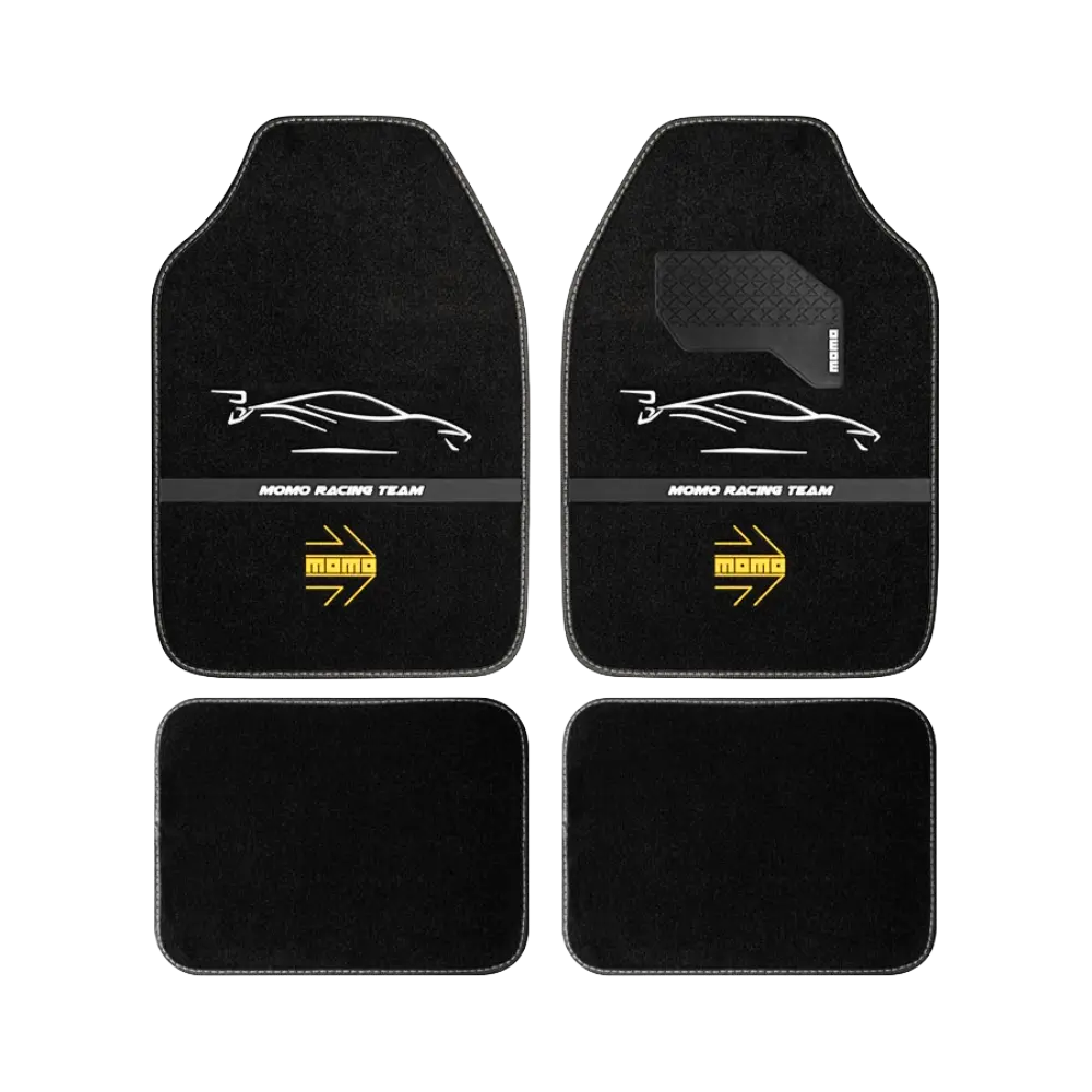 Universal 4-piece floor mat set in black with MOMO’s white silhouette design. Adds a clean motorsport look while protecting factory carpets from dirt and wear.