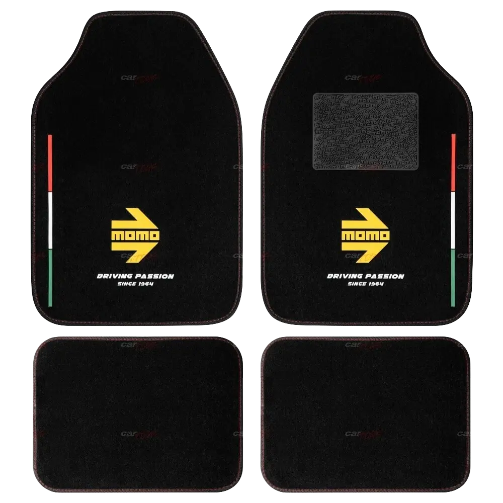 Floor mat set with MOMO Italia styling. Brings a tasteful motorsport touch to the cabin while guarding carpets against daily dirt and wear.