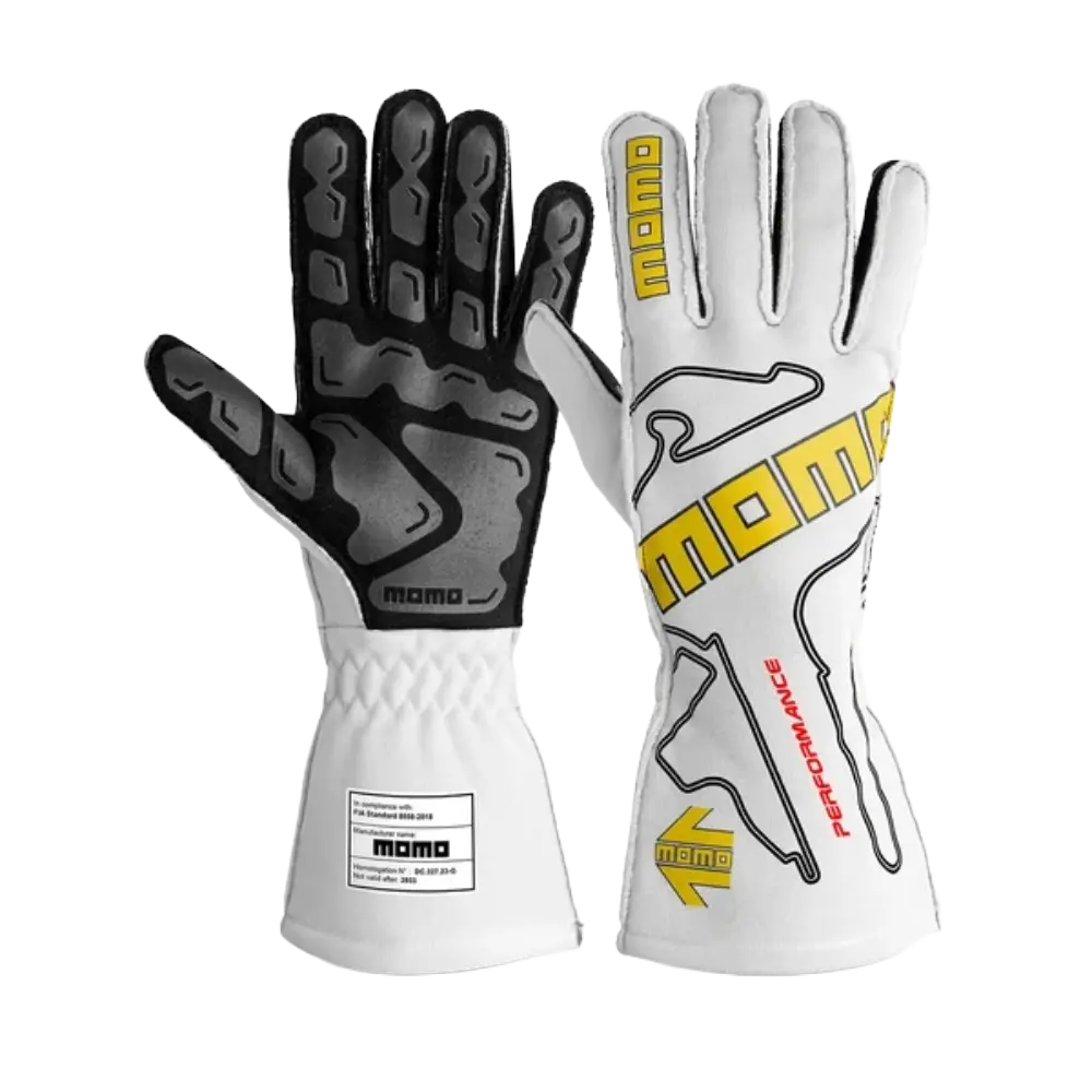 White performance driving gloves with grippy palms, ventilated backs and pre-curved fingers for crisp control and reduced fatigue. Size 11.