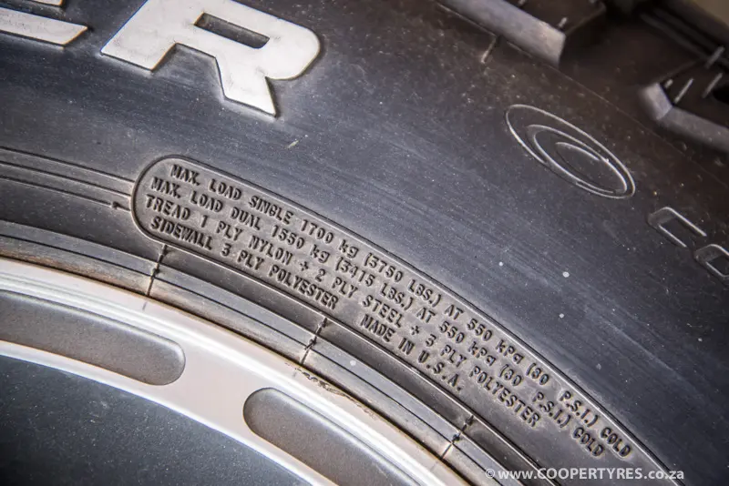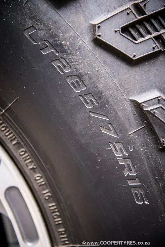 You can determine your tyre’s load capacity by looking at the small print on the sidewall. This particular tyre (a Cooper STT PRO 285/75/16) has a load capacity of 1 700kg!